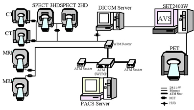 "Current PACS configuration, the thin lines represent the Ethernet network (10 Mbps), and the thick lines represent the ATM fiber connections (155 Mbps)."