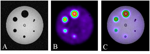 " (A) Transaxial image of a phantom acquired by MRI. (B) A corresponding co-registered transaxial image of the same phantom acquired by PET scanner. (C) A transaxial fused image slice showing excellent registration of PET and MRI images in X-andY direction."